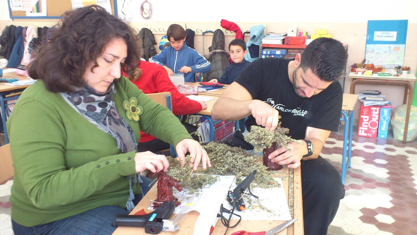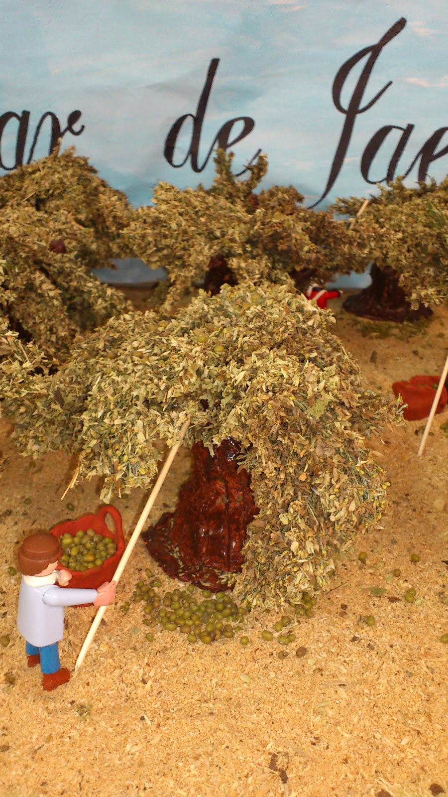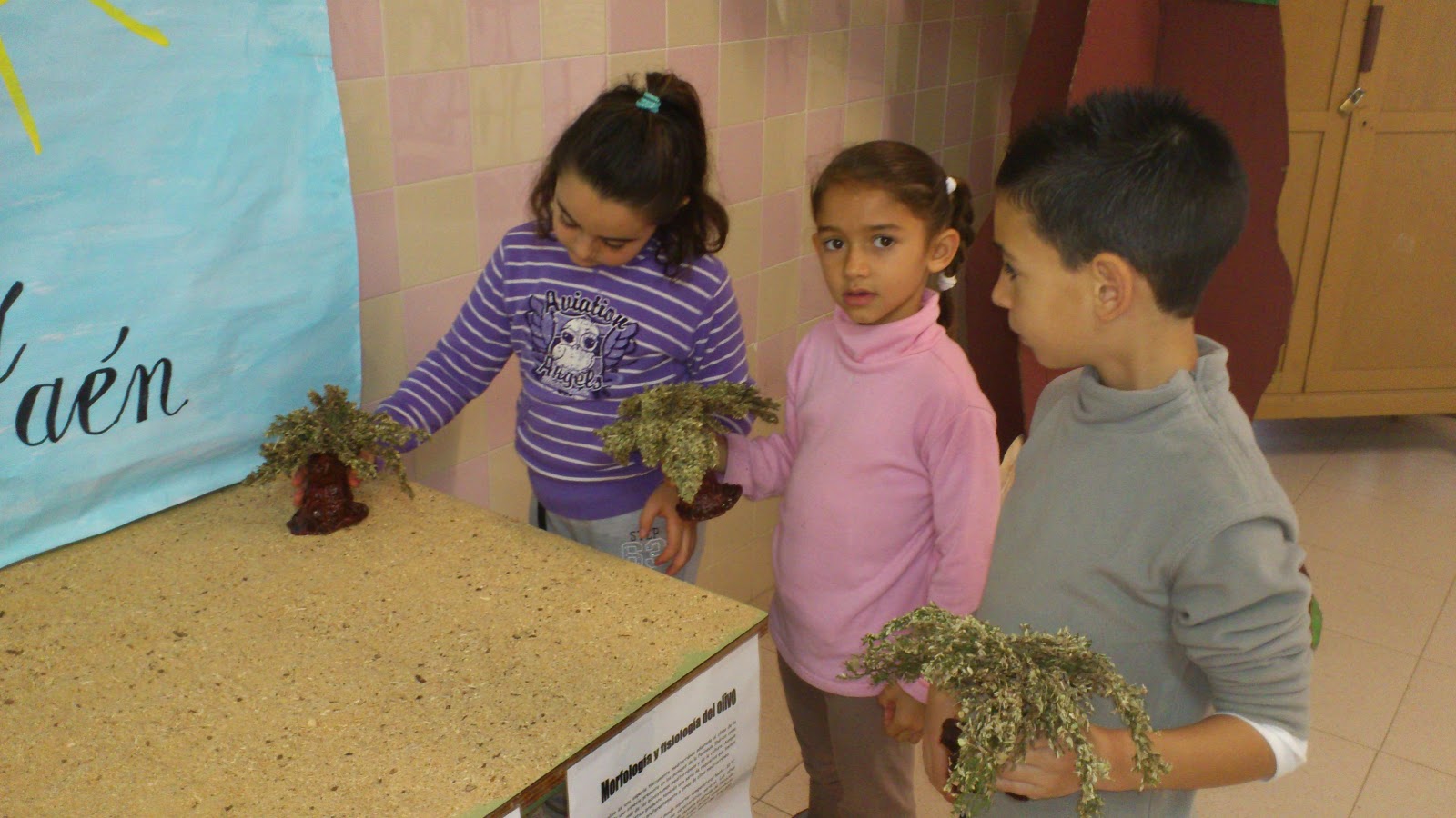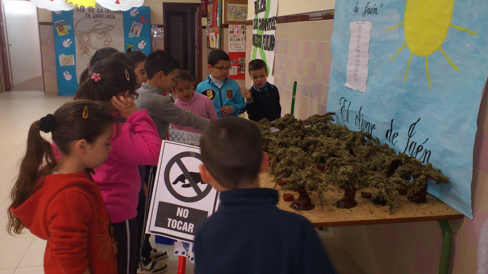 Paso nº 5: Realizamos un mural que nos sirva de fondo de la exposición. El maestro Paco nos ayuda a escribir el título con su buena letra. Montamos el olivar y colocamos sobre los olivos granos de soja verde imitando a las aceitunas.