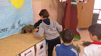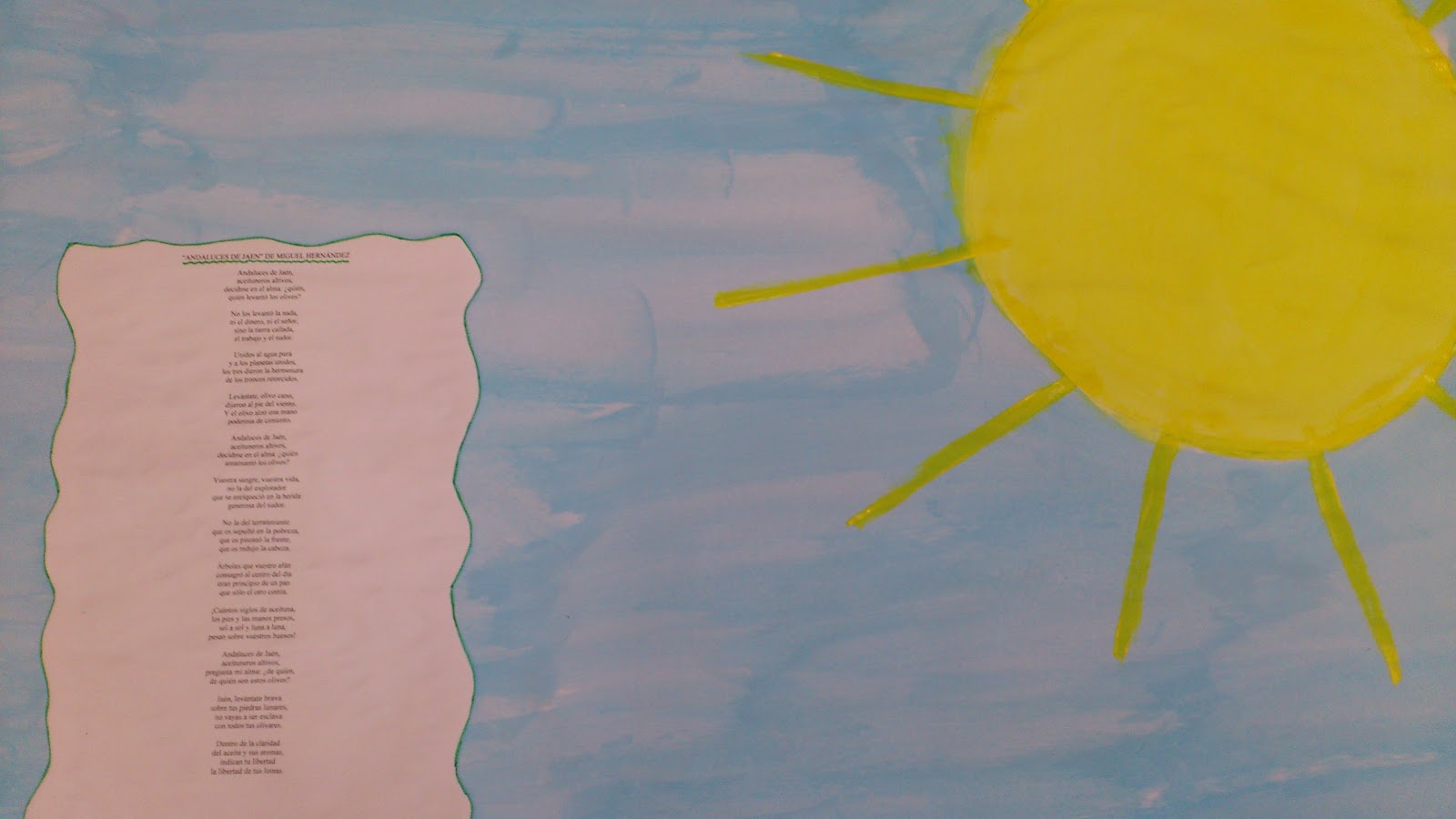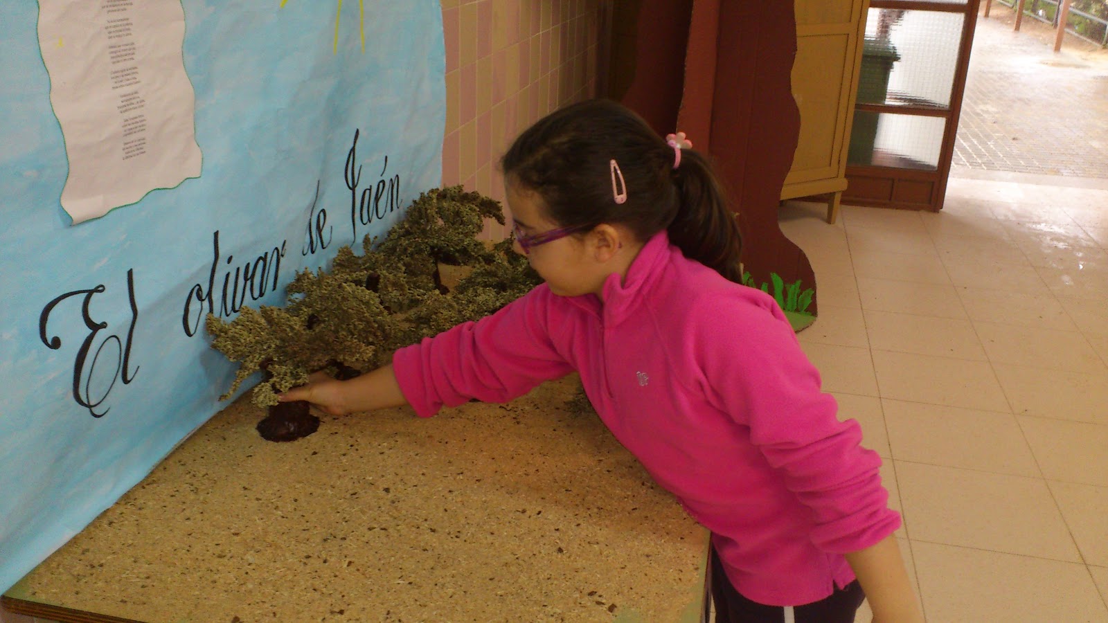 Paso nº 5: Realizamos un mural que nos sirva de fondo de la exposición. El maestro Paco nos ayuda a escribir el título con su buena letra. Montamos el olivar y colocamos sobre los olivos granos de soja verde imitando a las aceitunas.